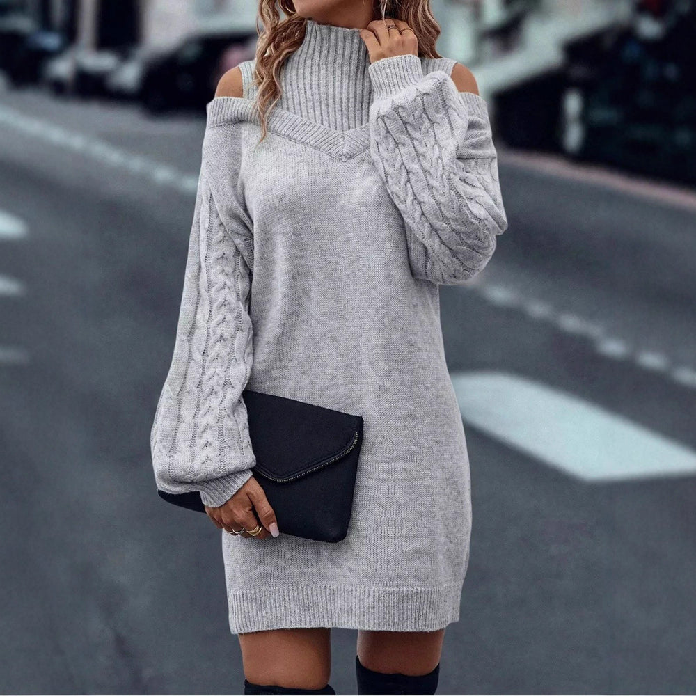Kvinnes strikkjole med asymmetrisk off-shoulder design og voluminøse ermer Skjora