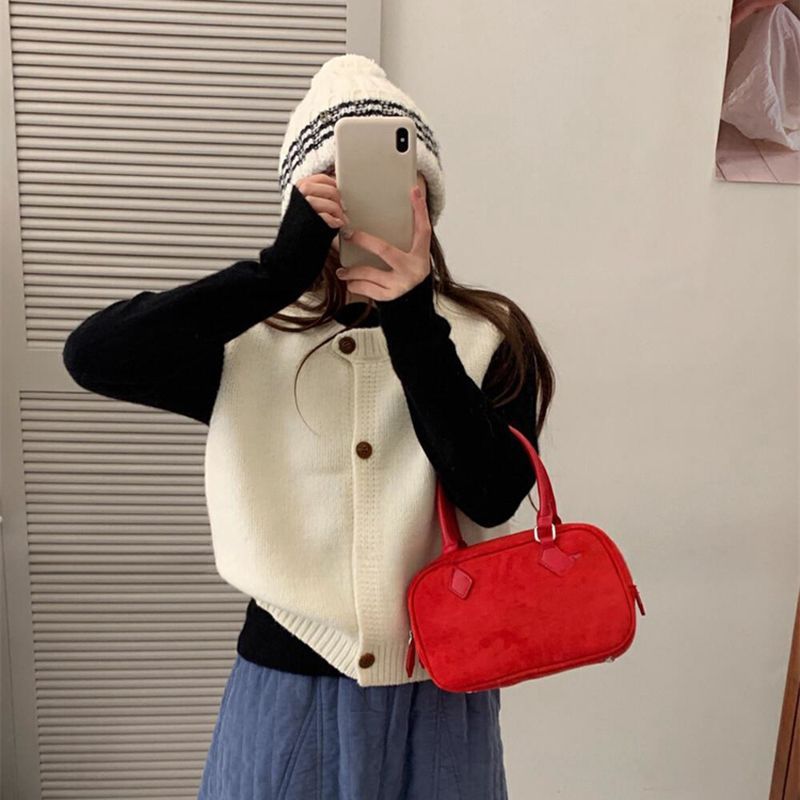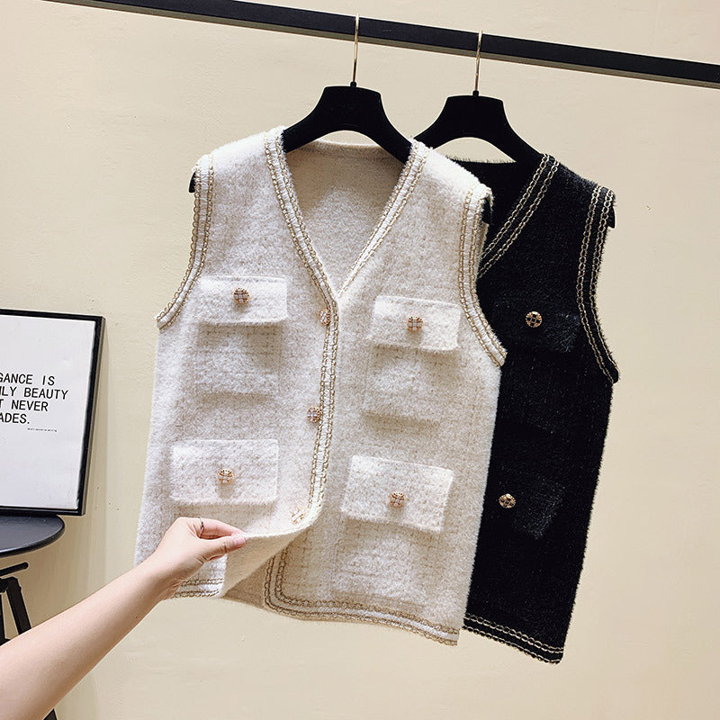 Kvinnes strikket vest med dekorative knapper og praktiske lommer Skjora