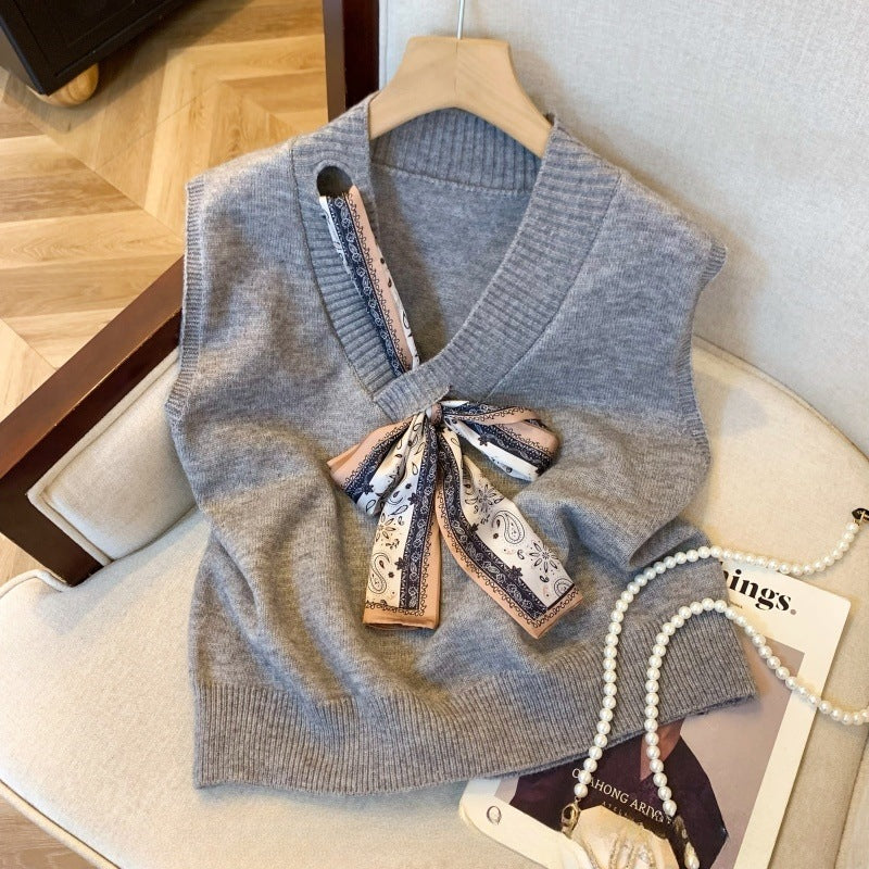 Kvinnes strikket vest med moderne skjerf applikasjon Skjora