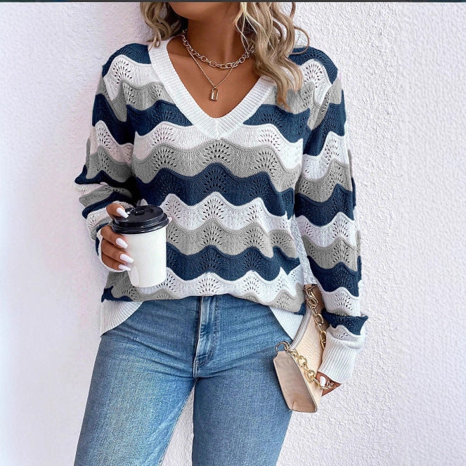Kvinnes V-hals genser med bølgete mønster og luftig struktur Skjora