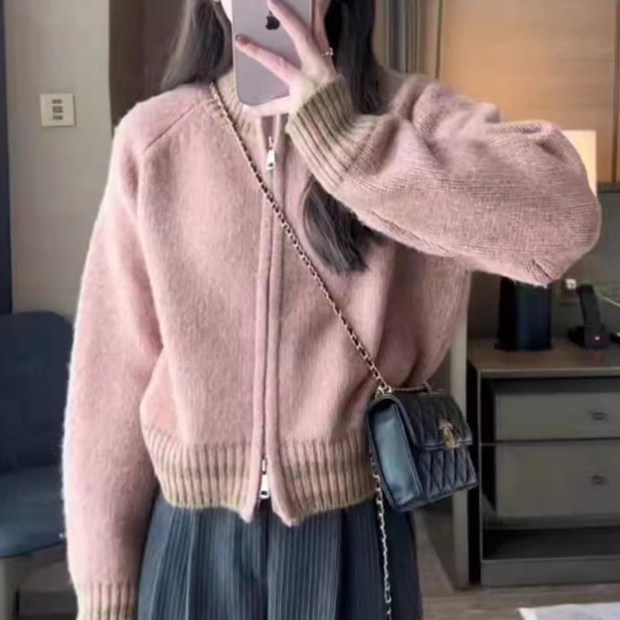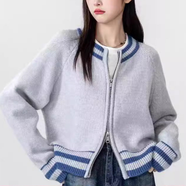Kvinnesporty strikket cardigan med glidelås og stripete mansjett Skjora