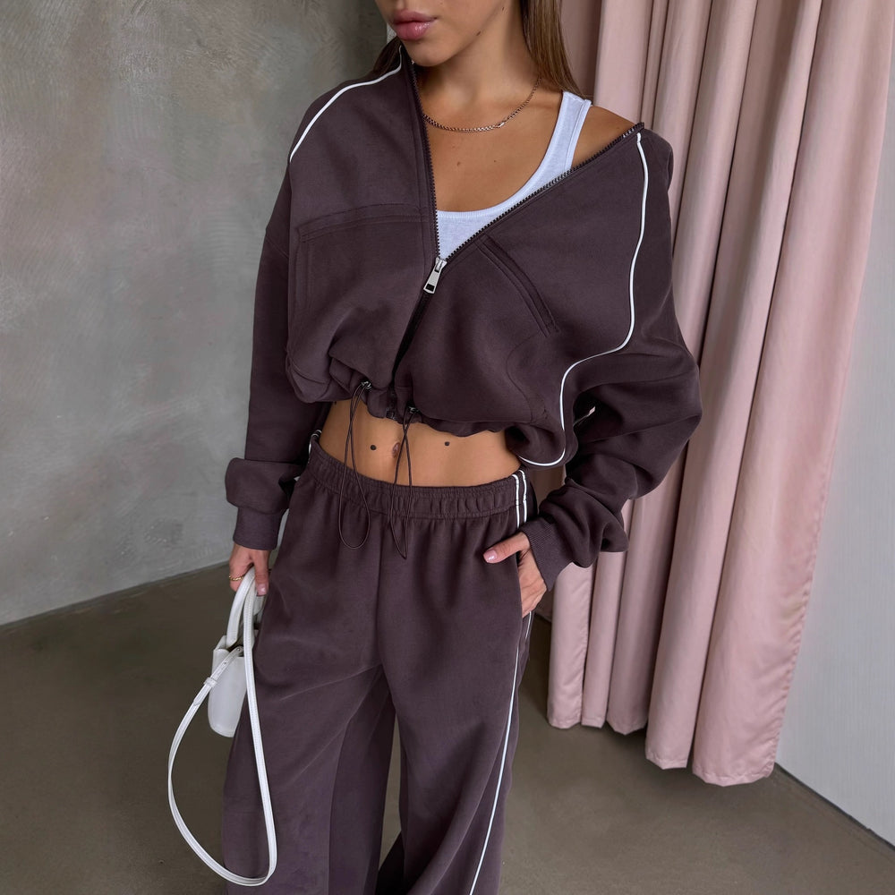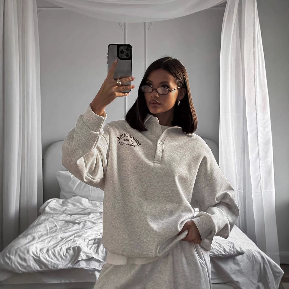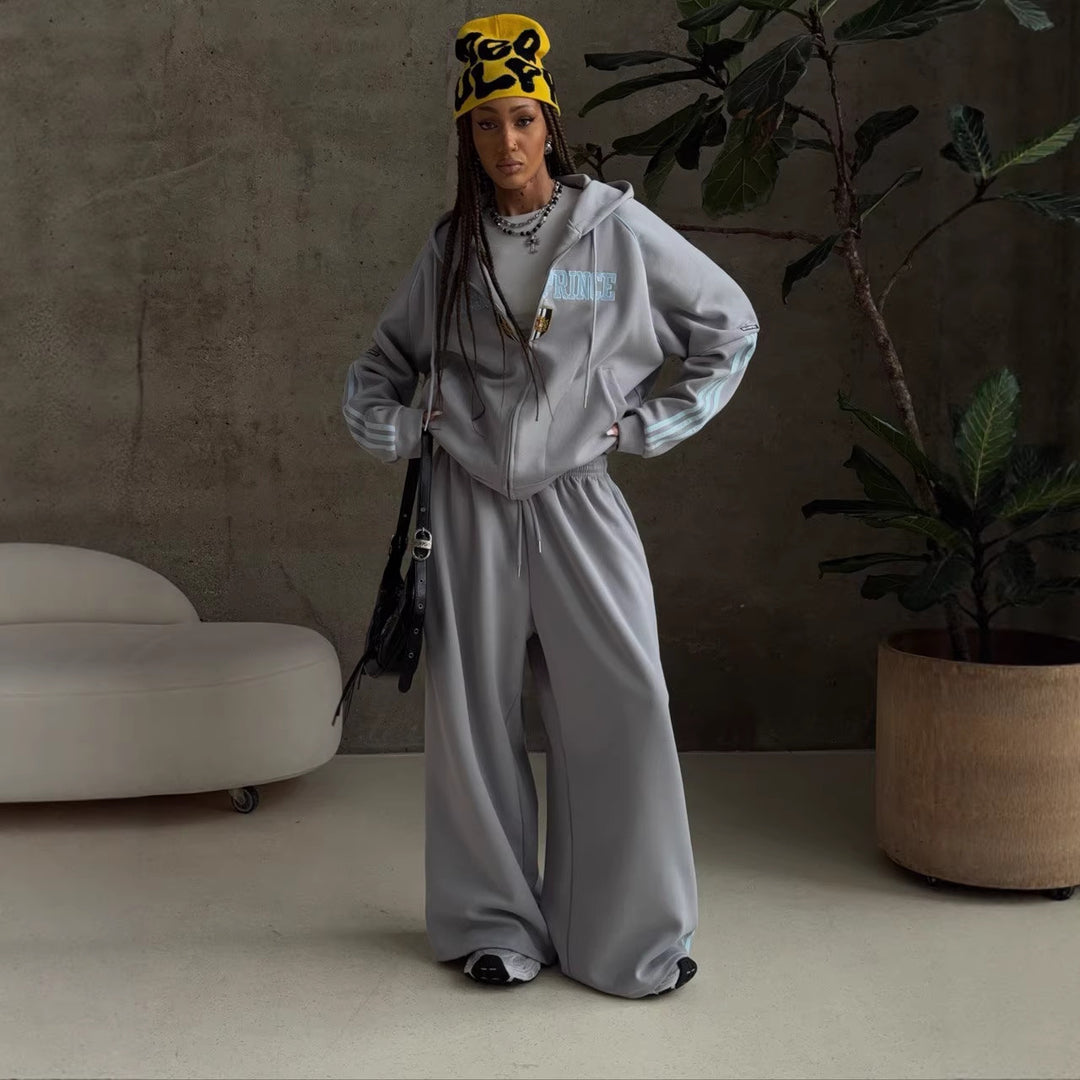 Kvinnesporty fritidssett med løst skjært hettegenser og løse bukser Skjora