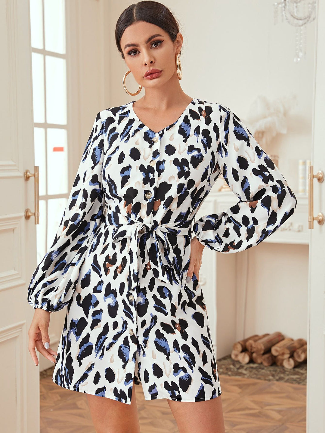 Dame blusekjole med dyreprint og tilpasset belte Skjora