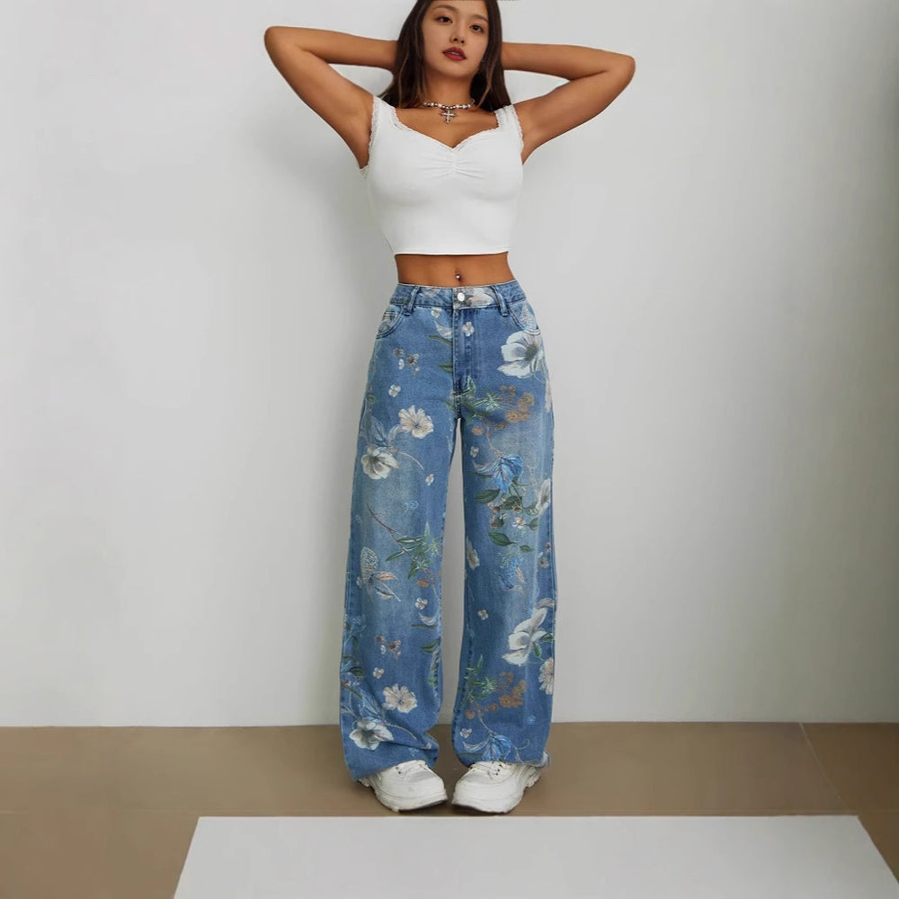 Dame brede jeans med blomstermønster og høy midje Skjora