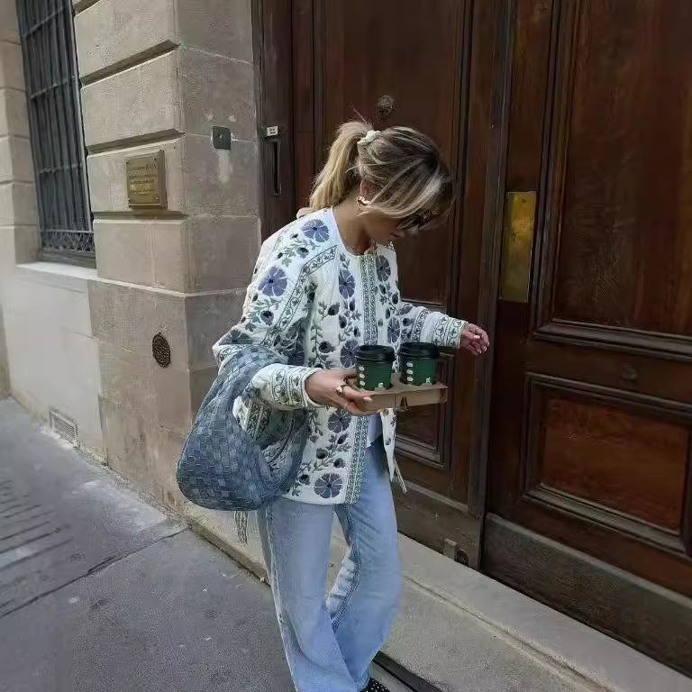 Dame blomsterpreget quiltet jakke med praktiske lommer Skjora