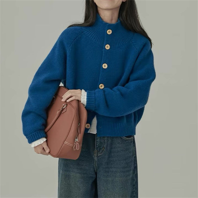Dame cardigan med høy krave og store treknapper Skjora