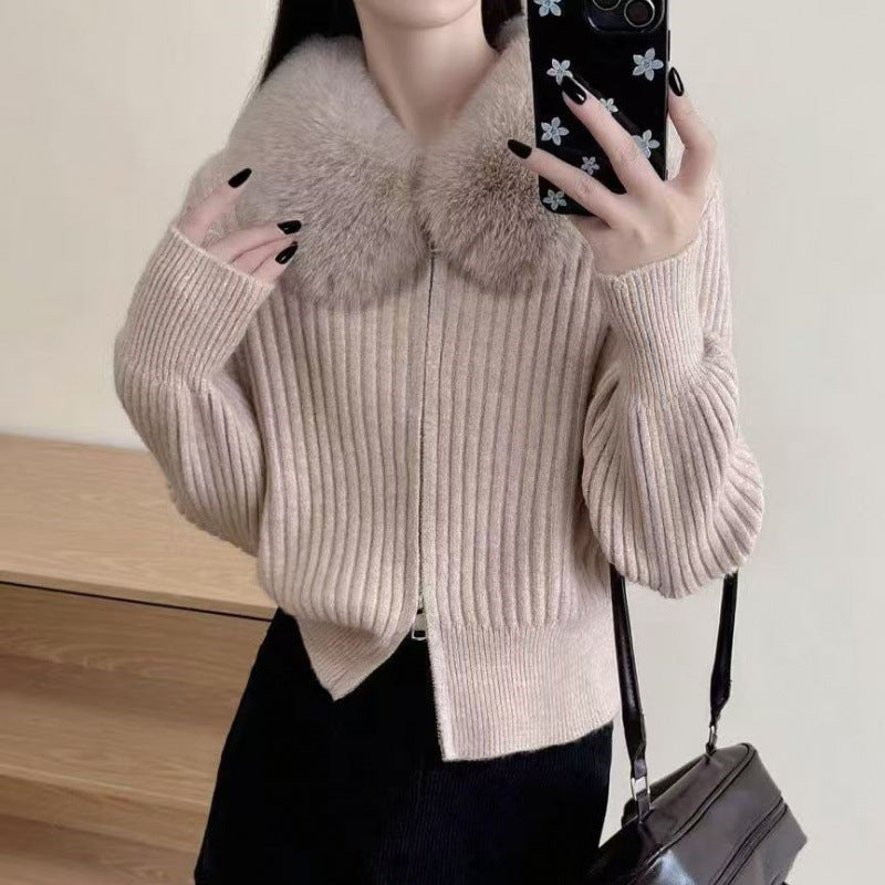 Dame cardigan med høykvalitets kunstig pelskrage og elegant ribbestrikket tekstur Skjora