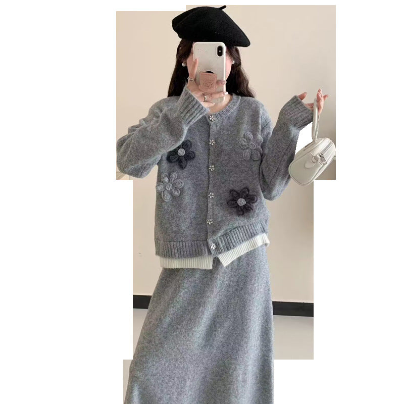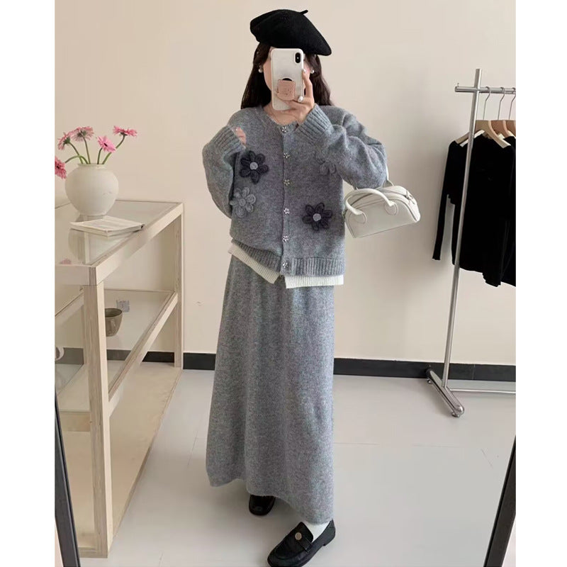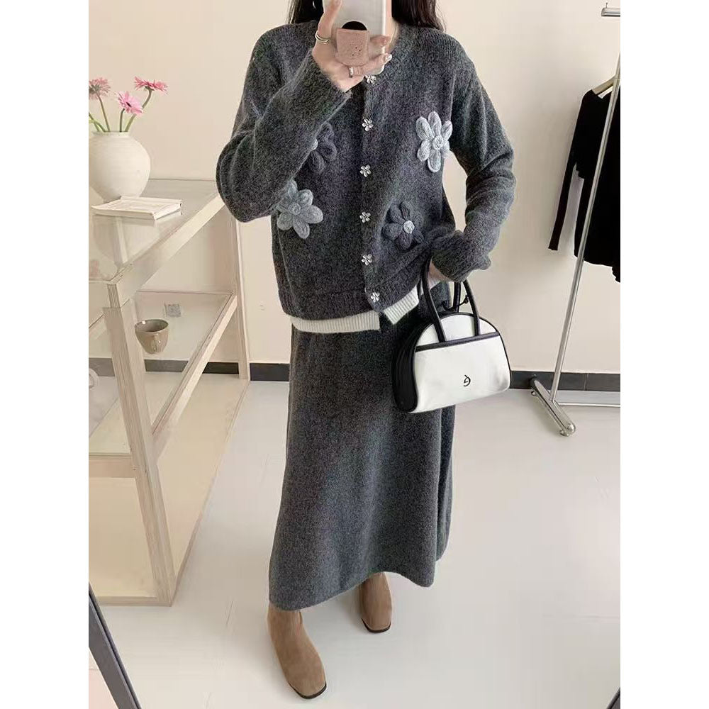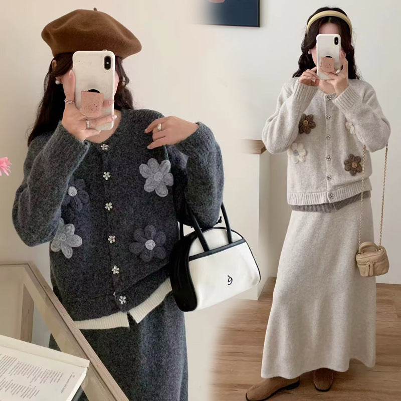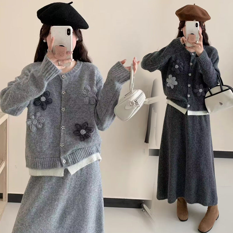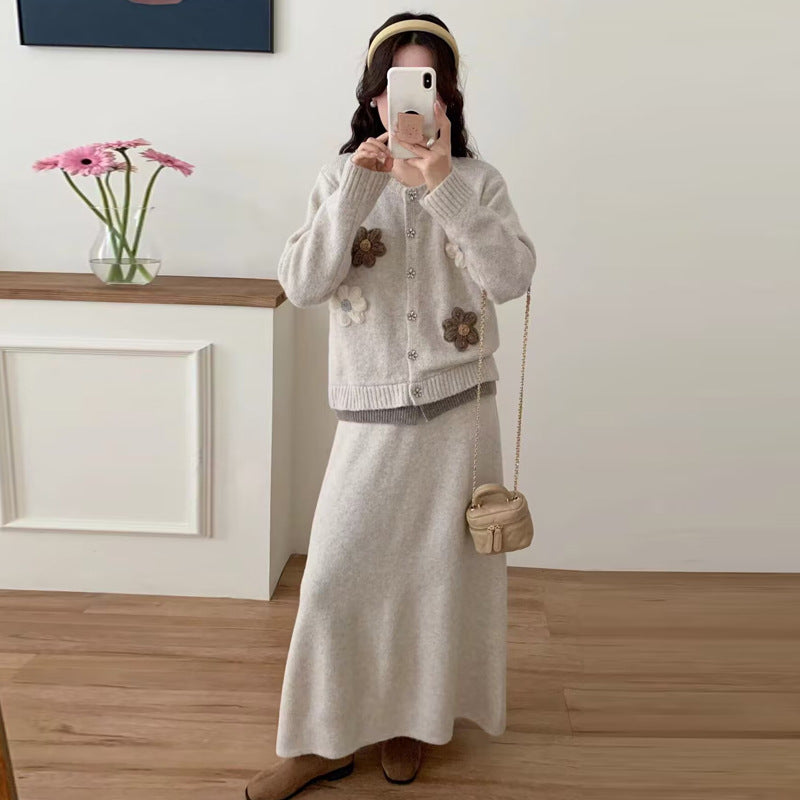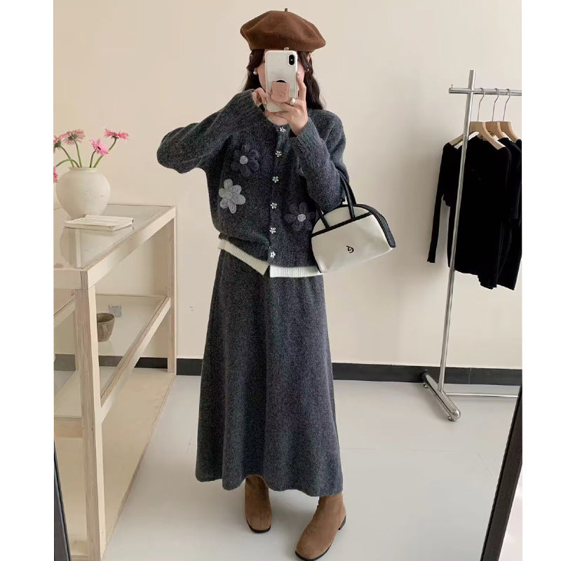 Dame cardigan med blomsterapplikasjoner og maxiskjørt Skjora