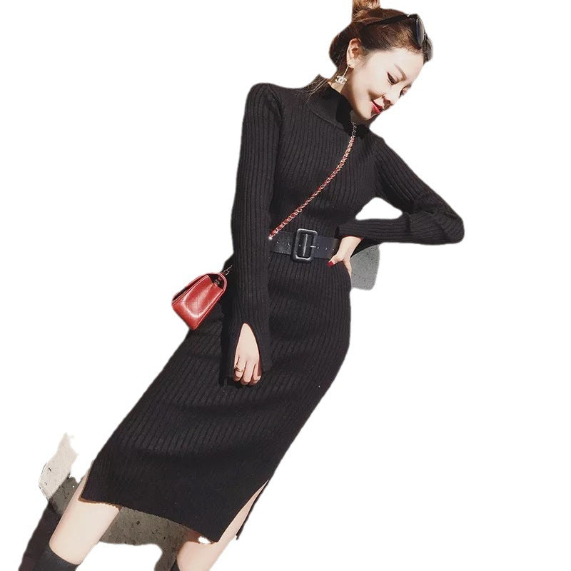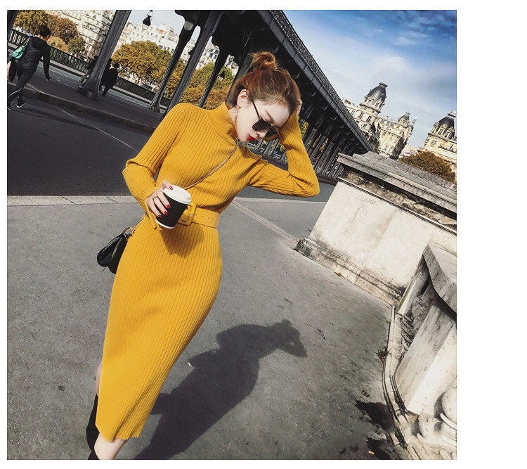 Oppdag vår stilige og allsidige strikkekjole, perfekt for den motebevisste kvinnen. Denne kjolen har høy krage og et elegant belte som fremhever midjen din og skaper en feminin silhuett.