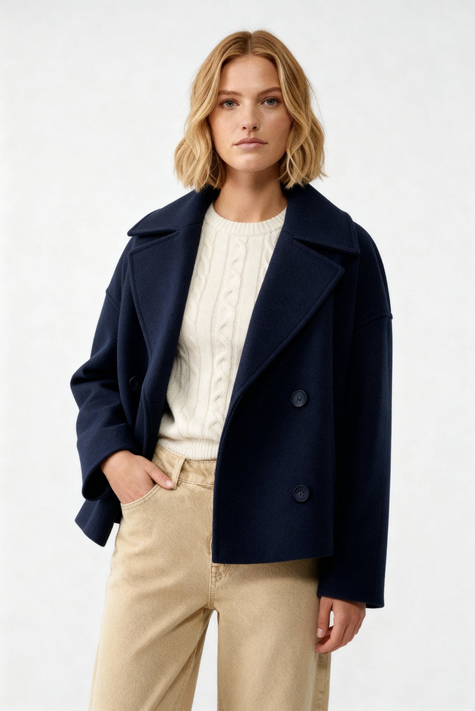 Denne korte, dobbelknapbare jakke kombinerer elegante linjer med en aktuel silhuet. Ideel til lagdeling, er den en uundgåelig del af et velplejet, alsidigt look.